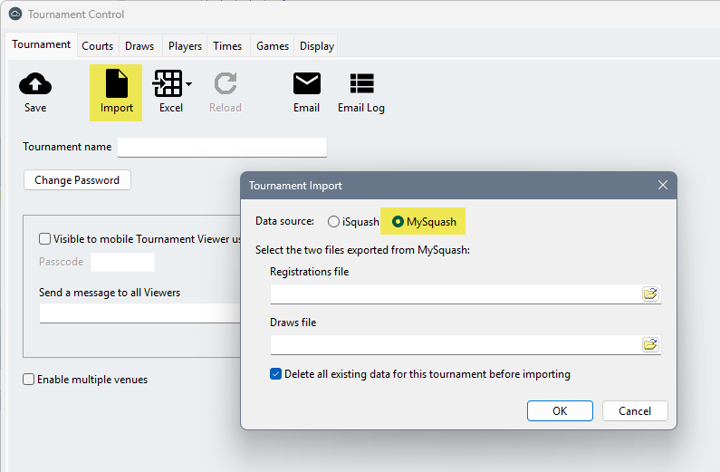 After a few months of “beta testing”, we have now officially released the first version of TC that can import tournament files from MySquash. Just select the “MySquash” option as shown below and then select your registrations and draws files as usual.